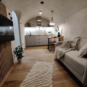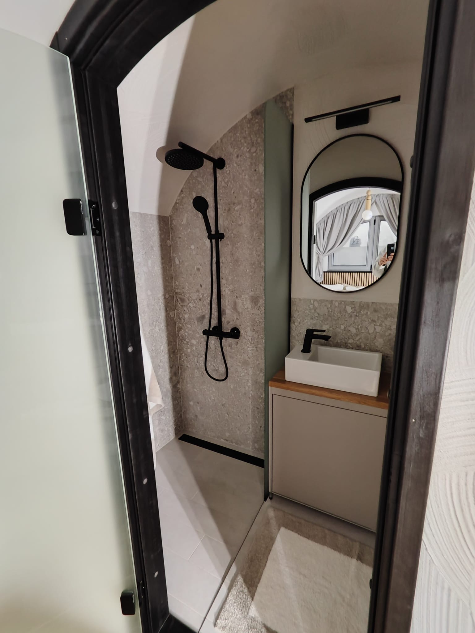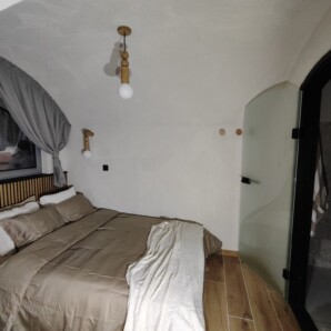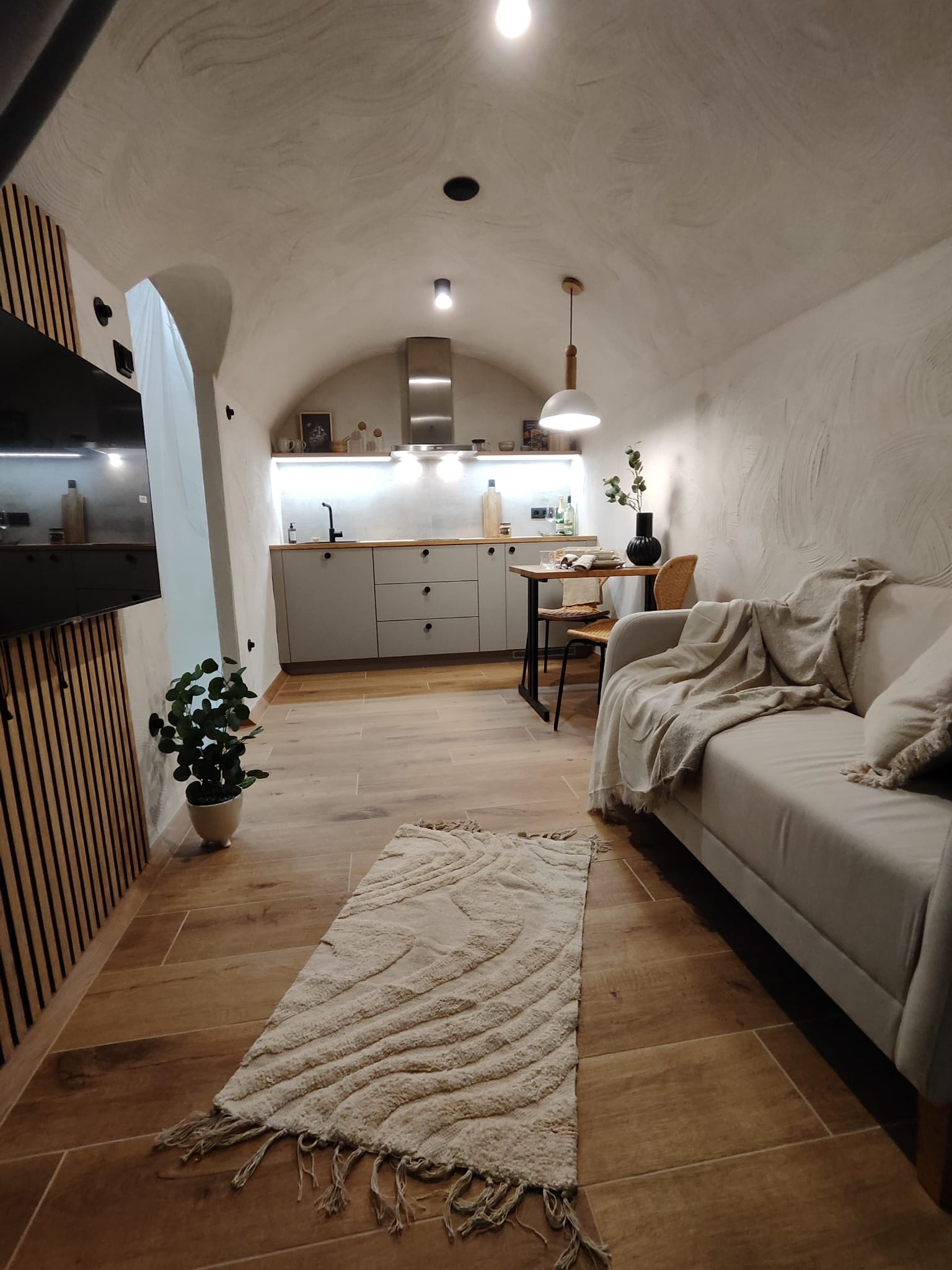 From the outside, it feels like part of the hillside. Step through the arched doors and you’ll find a fully equipped, thoughtfully designed interior: kitchen, living area and bathroom, all shaped by the vaulted concrete structure that keeps temperatures steady year-round.