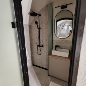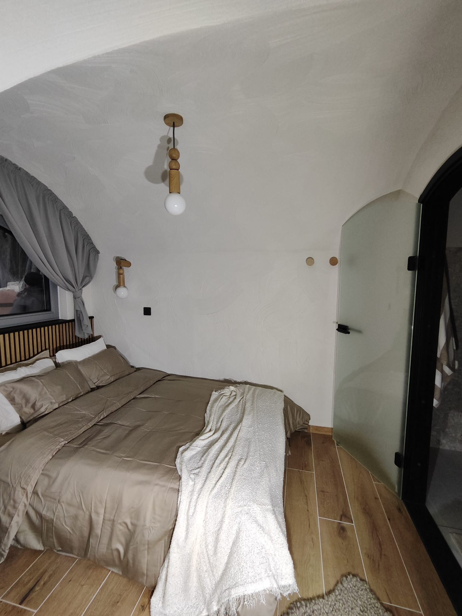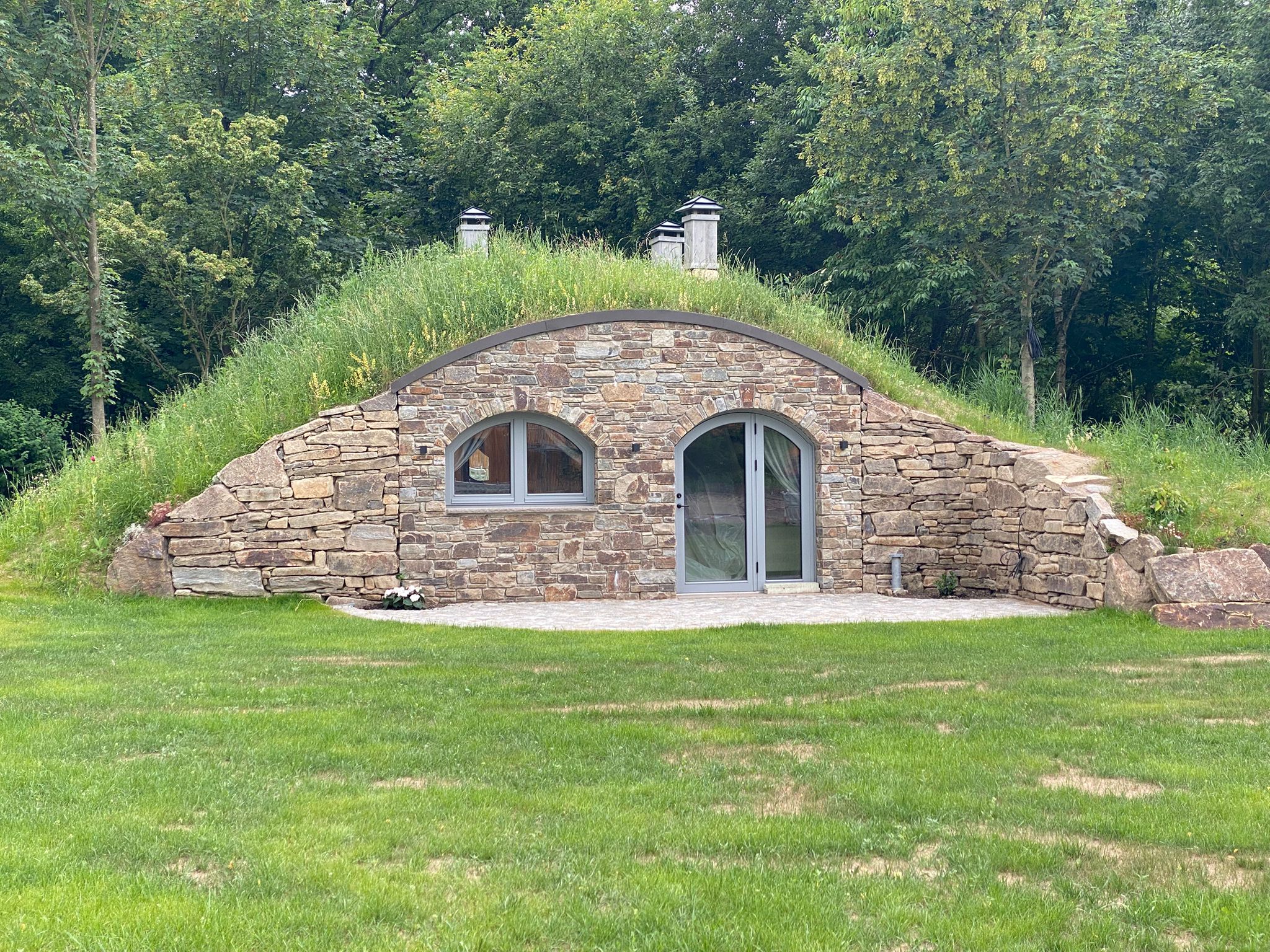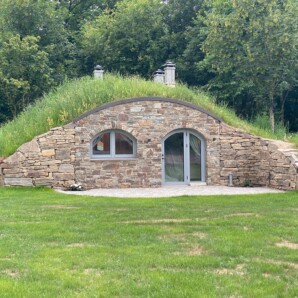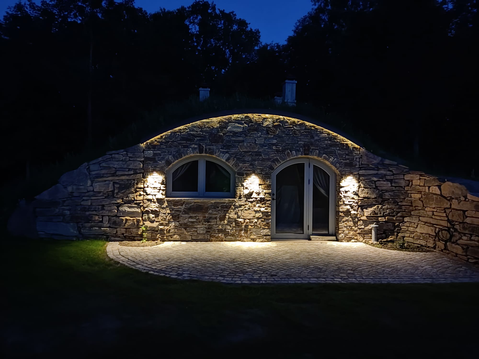 From the outside, it feels like part of the hillside. Step through the arched doors and you’ll find a fully equipped, thoughtfully designed interior: kitchen, living area and bathroom, all shaped by the vaulted concrete structure that keeps temperatures steady year-round.